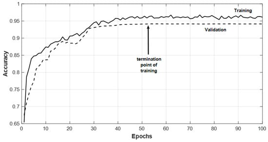 In this work, for SEED dataset, classification tests are conducted for two categories of classification: two-classes: Positive–Negative valence (Pos–Neg) and three-classes: Positive–Neutral–Negative valence (Pos–Neu–Neg). SEED dataset provides the labels as negative, neutral and positive. DEAP dataset labels the valence and arousal between one and nine. The valence values above 4.5 are taken as positive and the values smaller than 4.5 are taken as negative. For the LUMED dataset, classification is completed as either positive or negative valence. One-subject-out classifications for each dataset are conducted and the results are compared to several reference studies, which provide cross-subject and cross-dataset results. In one-subject-out tests, one subject’s data are excluded completely from the training set. The remaining training set is divided into training and validation sets. In this work, during training, when we do not see improvement on validation accuracy for six consecutive epochs, we stopped the training and applied the test data on the final model. An example is shown in Figure 6. For each user, Table 3 depicts one-subject-out tests for the SEED dataset based on all sessions together, with and without normalization and with and without output filtering. We also obtained the accuracy results without pooling and dense layers. The mean accuracies dropped by 8.3% and 11.1% without pooling and dense layers, respectively. Applying the median filter on the predicted output improves the mean accuracy by approximately 4% for the SEED dataset. The filter size is empirically and set to five. This corresponds approximately to six seconds of data. In this time interval it is assumed that the emotion state remains unchanged. It can be seen in Table 3 that the accuracy for some users is high and for some users it is relatively lower. This is based on the modeling of the network with the remaining training data after excluding the test data. However, standard deviation is still acceptable. Another issue is that when the number of classes is increased from two (Pos–Neg) to three (Pos–Neg–Neu), the prediction accuracies drop. This is because some samples labelled as neutral might fall into the negative or the positive classes.