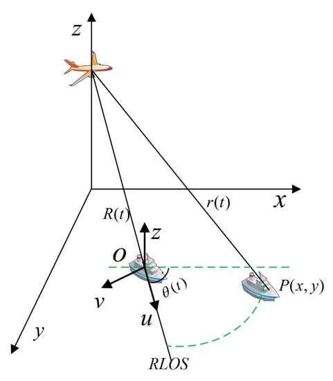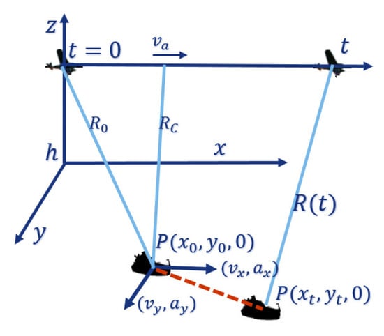 The geometry of SAR imaging of the moving target is shown in Figure 1. The target is described in Cartesian coordinates with the initial position at . The SAR platform moves along the predetermined track, where and h represent the velocity and height, respectively. , , , , , and are the observed target’s velocities and accelerations in azimuth, range and radar RLOS directions. t is the slow time, and the distance from point P to the radar platform is . is the distance between SAR and the target at the initial time, and . The target moves to at time t, and the distance between SAR and the target is .