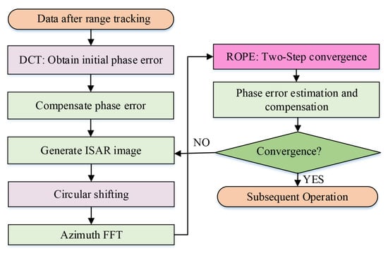 The nonparametric algorithms mainly include the maximum contrast (MC) [], minimum entropy (ME) [,], weighted least-squares (WLS) [], sharpness optimization [,], Doppler centroid tracking (DCT) [], phase gradient autofocus (PGA) [] and rank-one phase estimation (ROPE) [,] methods. Because the MC, ME, WLS and sharpness optimization methods do not make any assumptions about the characteristics of the target itself, they are highly adaptable. However, since the synthetic aperture process is non-stationary and random, such algorithms generally have local extremum problems. The DCT, PGA, and ROPE methods align the range envelopes and successively adjust the phase to compensate for the translational motion. The DCT and PGA [] methods are not model-based and exhibit robust performance. Nevertheless, their compensation accuracy is unsatisfactory if there are high-frequency and random phase errors. Furthermore, the model-based ROPE method assumes that each range bin contains no more than one scattering center. The main idea of the method is to use the phase finite difference to estimate the phase error, to find the phase average by alternating along the range direction and the azimuth direction, and to estimate both the phase error and Doppler frequency. In addition, the high azimuth resolution in ISAR processing is generated using a Doppler frequency gradient generated by the rotation of the target relative to the radar line of sight (RLOS) []. By averaging all range units of the estimated Doppler frequency, the phase error will be obtained more accurately with influences of the rotational phase weakened, ultimately owning a more precise compensation for the translational phase error. The most remarkable feature of the method is that it estimates not only the phase error of arbitrary order but also the wideband phase error. However, the ROPE method still includes some flaws: The model-based ROPE algorithm strictly requires that there be at most one strong scattering point for each range bin, which limits its application to many images that do not approximate the model; the performance of the method with respect to the phase error estimation will be greatly reduced under low SNR; and the ROPE method uses zero as the initial estimation for the Doppler frequency, which is blind and may lead to unsatisfactory estimates.