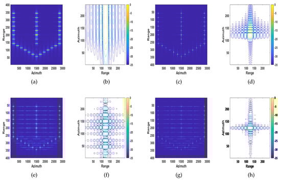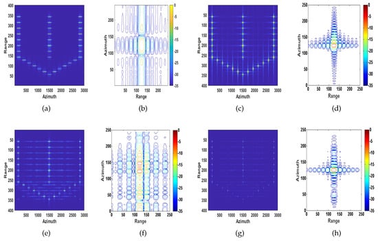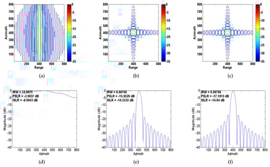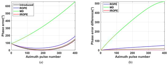 Ideally, the phase of the echo signal in the range and azimuth profiles varies linearly during the processing time. However, due to various factors, there exist undesired phase changes in the echo signal, which are collectively referred to as phase error []. Phase error, which is divided into low-frequency, high-frequency, and random phase errors, causes geometric distortion, resolution degradation, false targets, and reduced signal-to-noise ratio (SNR), thus resulting in poor image quality. Low-frequency errors encompass linear phase errors, quadratic phase errors (QPEs), and so on. The low-frequency phase errors primarily affect the main lobe of the system impulse response, while high-frequency errors affect the sidelobe regions. Random phase errors cause multiple pairs of echoes around the target, and the main lobe energy is reduced [].