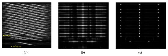 Here, represents the backscattered coefficients of the scatterer k. is the carrier frequency of the system, and , t and denote the fast time, slow time, and beam center offset time, respectively. The distance of point P from the radar is . represents range envelope (a sinc function) and represents azimuth envelope (a sinc-squared function) [].