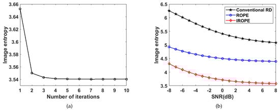 Let be the absolute value of a two-dimensional complex image, where m is the range sample number and n is the azimuth number. The image entropy (IE) [] is written as follows: