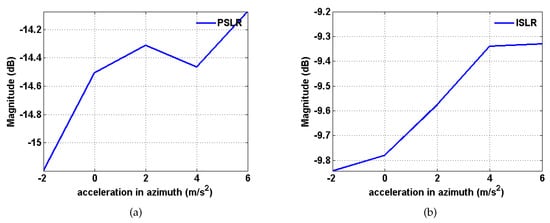 Moreover, assume that rad. w varies according to a step size of 0.1 rad/s from 0 to 1 rad/s []. The experimental results are shown in Figure 11. It can be seen that the magnitudes of PSLR and ISLR fluctuate with increasing rotational angular velocity, and the overall trend is upward. It is observed that the magnitudes of PSLR and ISLR fluctuate with increasing acceleration, and the overall trend is upward. The maximum magnitude of PSLR is below −14 dB, while the maximum magnitude of ISLR is below −9.5 dB, which means that the algorithm is suitable for practical situations.