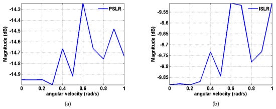 Variation in the magnitudes of PSLR and ISLR in terms of the rotational angular velocity based on the proposed method. (a) PSLR; (b) ISLR.
