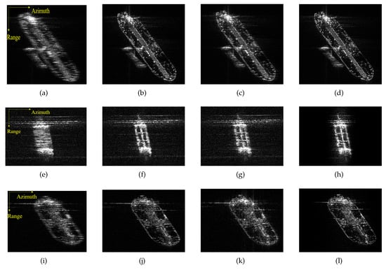 Original and refocused images. (a–d) Ship1; (e–h) Ship2; (i–l) Ship3.
