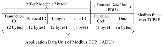 The ICS is composed of three parts: the management layer, the PLC control layer, and the sensing device layer. The industrial control network protocol is a communication protocol between the management layer and the PLC control layer. In the management layer, the operator gives control instructions in the form of a network message. The PLC receives the instruction from the management, updates the PLC data according to the internal control algorithm, and monitors the running status of the sensors in real time. The sensing device layer includes a variety of sensors, which are used to collect data from the industrial site and transmit them to the PLC. In the environment of water tower water level ICS, sensors include water level sensors and valve sensors. The Modbus TCP [8,9,10] is the most widely used industrial control network protocol, which uses a master/slave configuration protocol to communicate requests and responses between equipment. As shown in Figure 1, the application data unit (ADU) of Modbus TCP consists of two parts: the Modbus application protocol (MBAP) header and the protocol data unit (PDU). In the MBAP header, Transaction ID is the identifier of the request and response transaction. Protocol ID is used to identify the Modbus TCP. Unit ID is the identifier of slave equipment in the same network branch, and Length is the byte length sum of Unit ID, Function Code, and Data in PDU. Here, Function Code is the function identifier for a control instruction, and Data is the data information related to the control instruction.