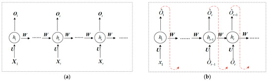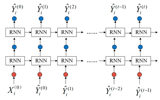 The process of the generation stage is shown in Figure 2b. The RNN model is trained, and the model weight parameters remain unchanged. The input value is , and each step has an output value. represents the output value at time , based on the generated message sequence and the current input message data , which is also taken as the input value at time . That is, the RNN generates the conditional probability distribution [22] of the output value at the current time by learning a protocol message sequence .