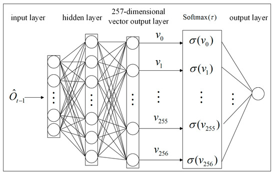 The softmax function [23,24,25] not only expresses the probability distribution of discrete random variables, but also preserves the gradient information of a neural network. The parameter adjusts the smoothness of the probability distribution to change the diversity of the random variable. Therefore, we use a softmax function as the activation function of the last layer of the RNN. Each hexadecimal data value is converted into a decimal integer, and the data value 256 is used as the end flag of a message. As shown in Figure 3, for input data at time , the RNN outputs the 257-dimensional vector , given by Equation (1).