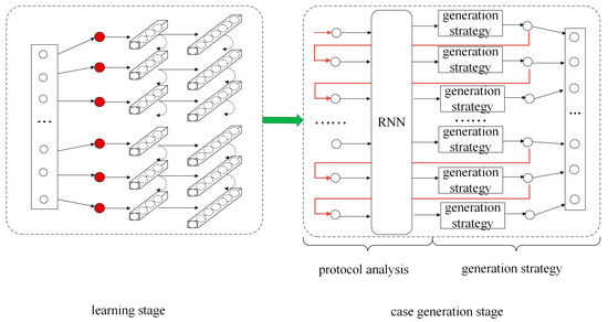 The structure of the model for test case generation in this paper consists of two parts: learning stage and case generation stage. The learning stage is used to learn the message of the training dataset and determine the weight parameters of RNN. The case generation stage is divided into protocol analysis and generation strategy. In protocol analysis, when a new field is input, RNN can determine the probability distribution relationship of the next generated field based on the learning of Modbus TCP message rules. The generation strategy is responsible for changing the information attached to its probabilistic relationship to generate the next protocol field. The changed field will be the input information for the RNN at the next time.