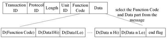 For each Modbus TCP message, the Function Code and Data of each protocol are selected. The two byte message fields are divided into high byte and low byte according to the high byte data and the low byte data, and the hexadecimal data values in each byte are converted to decimal data values. As shown in Figure 6, D represents a function that converts hex to decimal. Because the hexadecimal data range of a byte is 0x00–0xFF, after it is converted to decimal, the value range of each data value is 0–255, and all are integers.