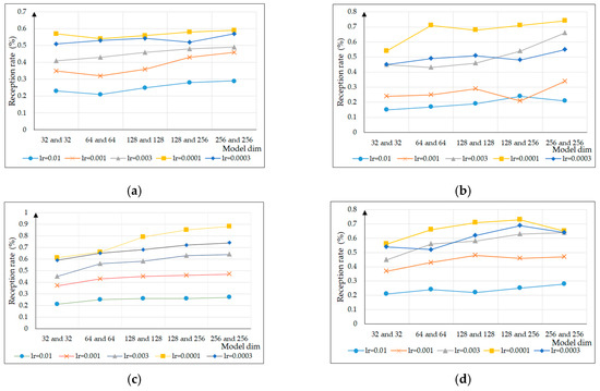 In this experiment, to select appropriate super parameters to maintain the ability of generating test case diversity, firstly, for the parameters, was 0.4, 0.5, 0.6, and 0.7, respectively, and the experiment compared the equipment reception rate with learning rates of 0.01, 0.001, 0.003, 0.0001, and 0.0003 and model dim of 32 and 32, 64 and 64, 128 and 128, 128 and 256, and 256 and 256, as shown in Figure 9. With an increase of the parameter , the reception rate of test cases generated by different model dim and learning rates for the industrial control equipment was also constantly changing and generally showed a trend of first increasing, then decreasing. When the parameter was 0.6, the model dim was 128 and 256, and the learning rate was 0.0001, with the reception rate reaching its maximum.