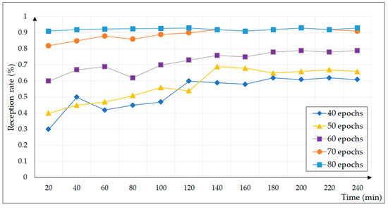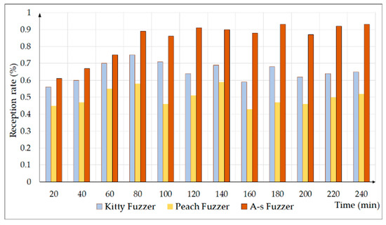 In the experiment, a learning epoch was selected to generate 14400 test cases for 40, 50, 60, 70, and 80, respectively, and a total of four hours of fuzzing test were carried out, as shown in Figure 10. In order to verify the effect of our A-s fuzzer, a test case was sent to the industrial control equipment every second, and the reception rate and vulnerability number of the industrial control equipment were counted every 20 min. The test cases generated by A-s fuzzer were not subjected to any elimination or manual intervention.