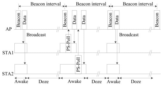 As the Wi-Fi standard has evolved over the past 20 years, power-saving technology has been continually improved. Figure 1 shows the operating mechanism of the legacy power-saving mode (PSM) []. Usually, a WLAN consists of one or more access points (APs), which connect to the wired LAN, and remote client devices that connect to the AP by a wireless link. The remote devices are usually portable devices or sensors that use battery power. When the legacy PSM is used, the power-saving station wakes up at the beacon transmission period to send a periodic beacon frame during the doze mode. The traffic indication map (TIM) shown as the station’s association ID (AID) in the received beacon frame is examined to check if the traffic specified by the address is waiting to be sent in the AP buffer. After checking whether it has data to send, the station enters wake mode or doze mode. If there is no data to send in doze mode, dynamic power consumption can be reduced by gating the power supply device or system clock.