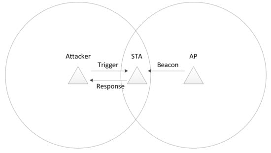 Figure 2 shows the network configuration for the battery draining attack. The AP and station are associated and connected to each other. The station is in power-saving mode. It periodically receives the beacon signal from the AP and performs power saving. At this point, the attacker sends a trigger signal to the station and causes the transmission of a response frame. The station becomes the victim of the attacker as it is unable to enter the doze mode and continuously transmits response frames and consumes power.