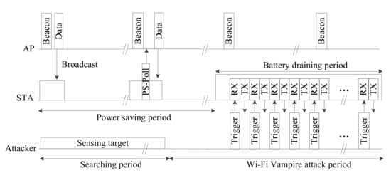As such, great importance is placed upon the security and efficiency of the power-saving mechanisms of Wi-Fi-based IoT in environments used in fields related to human life, safety, and property. Currently, the range of uses of Wi-Fi is quickly expanding into areas intimately connected to people’s lives, safety, and property, such as smart homes, smart factories, smart grids, smart cities, vehicular networks, and medical implantable devices [,,,,]. In the past, attacks that shut down Wi-Fi only caused harm to data availability. However, owing to the spread of IoT and the development of information communication network technology, the cyber world and the physical world are always connected, and the influence of sensors and communication devices is gradually increasing []. In an increasing number of cases, attacks are threatening human lives and safety or damaging property. To extend the battery lifetimes of Wi-Fi-based IoT and ensure security in terms of the availability of services related to human life, safety, and property, there is an urgent need for countermeasures based on analyses of security vulnerabilities to battery draining attacks.
