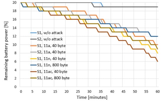 Figure 5 shows the results of the battery draining attack experiment. The experiment results show the amount of remaining battery in the smartphones made by Company S1 and Company S2 according to whether an attack occurred and the attack type. When there was no attack (w/o attack), the normal power consumption of a power-saving Wi-Fi device occurred. However, during the battery draining attack, triggering frames were used to prevent power saving from occurring. To determine the difference between manufacturers, the manufacturers S1 and S2 were compared in the w/o attack case and the 802.11a standard frame case. To determine the effect of frame length in the 802.11n and 802.11ac formats on the S1 smartphone, tests were performed with 40-byte and 800-byte frame lengths. When the attacker did not perform the attack, the station operated in the normal power-saving mode, and the power consumption efficiency was good. When the attacker began the attack, the power consumption increased significantly.
