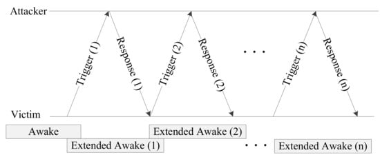 Figure 3 shows a timing diagram of the battery draining attack. As the target station performs power saving, it is periodically woken to receive the beacon frames sent by the AP, and the power-saving mechanism operates. At this point, the attacker finds the attack target station and then sends a trigger frame. When the attacker periodically sends a trigger frame, the target station is triggered and sends a response frame. The wake mode of the target is extended by this periodic operation process. If another trigger frame is sent before the extended wake mode interval is finished, the wake mode is extended. If trigger frames are sent at fixed intervals in this way, the attack target cannot enter the power-saving mode. Consequently, the target station consumes power to receive the triggering frames and send the response frames, and it cannot perform power saving for the length of the extended wake mode time. As it sends response frames from a waking state, its power consumption is increased.