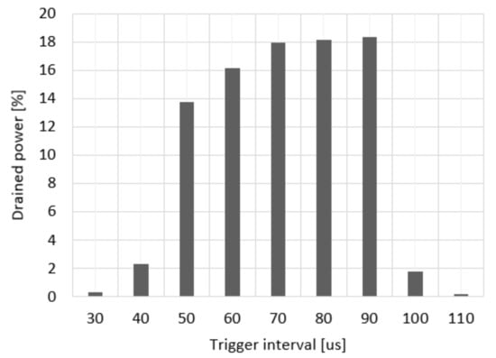 Figure 7 shows the results of the experiments on the power consumption of the attack target according to the triggering interval. The effect of the battery draining attack tested in this study can be optimized by finding a suitable triggering interval, transmission speed, and packet size, and then by adjusting the parameters and observing the response of the target. Consequently, the attacker can cause the attack target to shut down in a short amount of time. According to the experiment results, more than 14% of power was consumed when the triggering interval was set to 50–90 µs. When the triggering interval was less than 40 µs, the transmission time of the response frame overlapped with that of the next triggering frame, and therefore, the attack was not effective. When the triggering interval was greater than 100 µs, the time until the next triggering frame exceeded the time limit in which the awake time of the target can be extended, and the attack was not effective. As shown in the experiments, the attacker can observe the response frame and train the triggering frame interval to determine the suitable frame interval.