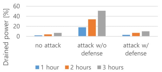 However, the above two methods have the problem of either revising the existing standards or modifying the implemented chipsets. To improve the security of the existing Wi-Fi chipsets that contain the vulnerabilities to the battery draining attacks, the Wi-Fi power switching method was tested in this study. The Wi-Fi power switching method can be applied with either a firmware or software level patch even if a traditional chipset is used. This is because if a repeat triggering frame is detected, the Wi-Fi function can be switched off and the attack can be monitored again after the power-off duration. The power-off duration can be increased several times or exponentially depending on the number of repeated detection of attacks. If a battery draining attack is detected by monitoring the repeated triggering frames, it is designed to prevent the worst-case scenario when the main system is shut down by powering off. The Wi-Fi power switching method powers off only the Wi-Fi functions and maintains other activities in the system. In the Wi-Fi power-off state, the main system stores the data in memory. When it needs to transfer the stored data to the AP, it powers on and transfers the stored data. Figure 8 shows the defense efficiency against a battery draining attack when the Wi-Fi power switching method is applied. In this experiment, 11ac mode 40-byte length frames with a trigger interval 80 µs were applied for attack and measured the drained power at intervals of one to three hours with a one-hour step. In this test, the power-off state duration was increased by 2^n minutes, where n is the cumulative number of attack detections.