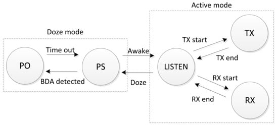 Figure 9 shows the power state diagram for the proposed Wi-Fi power switching method. There are five states of Wi-Fi devices. The TX, RX, and LISTEN states are parts of the active mode, and the power-save (PS) and power-off (PO) states are parts of the Wi-Fi doze mode. In the active mode, the wireless device is in an awake state and actively transmits/receives data with the access point. If the wireless device determines it is not being paged, it enters the power-save state. Otherwise, it enters the awake state for a certain period of time to receive the data frames. The Wi-Fi power switching method turns the Wi-Fi radio off when a battery draining attack (BDA) is detected.