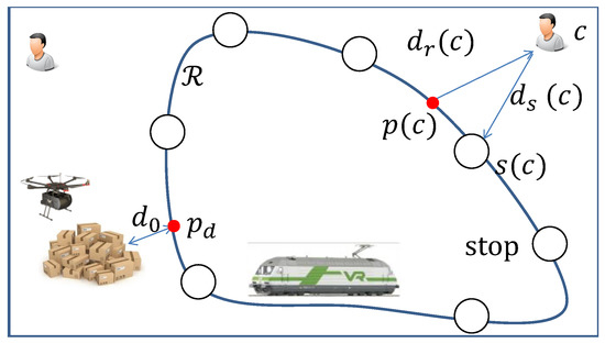 For the drone–vehicle scheme, the delivery area further depends on the route . The trip time is no smaller than the flight time for customer c, i.e., , since the drone travels with vehicles in this scheme. For this scheme, we introduce some new notations. Let be the point on which is the closest to the depot. Let be the distance between the depot and , see Figure 1. For customer c, let denote the point on , which is the closest to the customer c. Let denote the distance between the customer c and the point . Let denote the stop which is the closest to customer c and let denote the distance between customer c and stop . The flight time for customer c is defined as follows and if it satisfies the right inequality, customer c can be delivered by the drone–vehicle scheme: