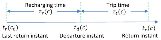 No matter which delivery scheme is used, after returning from the last customer at time instant , the drone may start to recharge the battery. The recharging time is denoted by if the next customer to be delivered is c. Once the energy is sufficient, the drone may depart to deliver to customer c at instant . The return instant for customer c is denoted by and the trip time is . Throughout this paper the notation t with some subscript or superscript is used to represent a time instant, while is used to represent a time interval. The relations between some important notations are demonstrated in Figure 2.