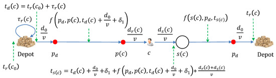 The arrival time at can be still regarded as . Then, the travel time from to is given by . After that, the drone leaves the vehicle at point , flies to the customer c, drops off the parcel, and then flies to the stop . When the drone arrives at , the time instant, denoted by , is computed as follows: