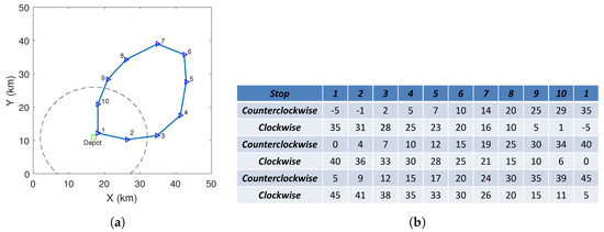 In an area as shown in Figure 5a, some vehicles keep running on the given route. There are 10 stops along this route where the drone can rest (represented by triangles with labels). There is a timetable associated with these stops, see Figure 5b where the unit is minute. The vehicles are running in two directions: clockwise and counterclockwise. We generate the basis of the timetable which is the middle two rows in Figure 5b. Specifically, at instant 0, there is a vehicle departs stop 1, it moves counterclockwise and arrives at stop 2 at instant 4, stop 3 at instant 7, etc. This vehicle finally returns to stop 1 via stop 10 and the arrival time at stop 1 is at instant 40. At instant 0, another vehicle departs stop 1 and it moves clockwise. It arrives at stop 10 at instant 6 and at stop 9 at instant 10. With this basis, we generate the first two rows’ and the last two rows’ timetable, where the interval between two vehicle departures is 5 min. More parts of the timetable can be generated in the same way, but they are not shown. As the timetable only provides the information about the time instants at stops rather than the positions between two stops, the time instants at which the vehicles pass the nearest points to customers need to be estimated. For this, we assume the vehicles run at constant speeds between any two neighbour stops. Other system parameters are: unit, unit, unit per minute, and km per minute (The values for the parameters , p and v are based on the data of the Amazon Prime Air project in which a drone can fly about 32 km in 30 min.).