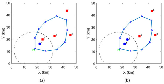 Firstly, consider a case with 5 randomly generated customers, see Figure 6, where the schedules by the two algorithms are shown. The labels near the customers give their positions in the permutations. The delivery schemes are marked differently: red squares are by drone–vehicle scheme and blue circles are by drone-direct scheme. The optimal schedule delivers to one customer by the drone-direct scheme while the sub-optimal schedule delivers two customers by the drone-direct scheme. Their delivery permutations are different. The schedule by the exact algorithm uses 210 min to deliver to all the customers and the algorithm running time is about 0.333 s, while that of the sub-optimal algorithm uses 215 min, which is very close to the optimal solution, and it takes only 0.001 s to run the algorithm (The algorithm running time is measured in Matlab on a PC with: Intel(R) i5-3570S CPU and 8 GB RAM). For the comparison with the drone-direct only scheme, we also show the delivery area by this scheme (which is the black dash circle). For this example, only 2 out of the 5 customers can be delivered by the drone-direct scheme, while they all can be delivered by the proposed delivery system. This feature exists in all the other simulated cases. Of course, due to the randomness, there are some customers that cannot even be delivered by the drone–vehicle scheme, but the deliverable ratio of the drone–vehicle scheme is generally larger than that of the drone-direct scheme.