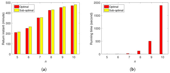 We conduct more simulations for different numbers of customers n to demonstrate the performance of the sub-optimal algorithm against the exact algorithm. As the complexity of the exact algorithm is exponential to n, we only conduct simulations with up to 10 customers using the exact algorithm. As shown in Figure 7a, in all these simulations, the return instants by the sub-optimal algorithm are only 5 to 15 min more than the schedules obtained by the exact algorithm. The advantage of the sub-optimal algorithm lies in the computational efficiency. As shown in Figure 7b, the algorithm running time of the exact algorithm increases dramatically with n. However, that of the sub-optimal algorithm is lower than 0.1 s for these cases. From these results we can see that the proposed sup-optimal algorithm achieves close performance to the optimal solution and it is computationally efficient.