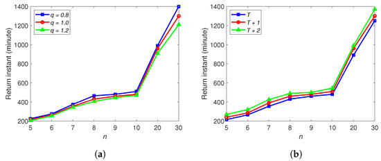 We first consider the parameters of p and q. To study their impacts, we fix p as 1 and consider some values of q. When , the recharging time becomes longer to recharge a certain amount of energy than the consumption of the same amount; while when , the recharging process becomes faster. It can be seen from Figure 8a compared to the cases with , when , the return instants for the above cases become smaller; while when q is decreased to 0.8, the return instants all become larger. Clearly, the larger the q, the more efficient in terms of recharging, and then the drone can be back to deliver the next customer sooner.