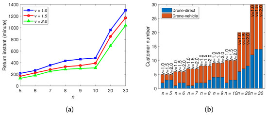 Finally, the impact of the drone speed v is considered. In all the above simulations, the value of v together with those of and p are consistent with Amazon Prime Air project. Here, we keep the values for and p, and consider some higher speed. The timetable is used here. According to our model, increasing v enlarges the delivery area of both the drone-direct scheme and drone–vehicle scheme, see (3) and (9). The final return instants for all the cases have a decreasing trend, see Figure 9a, with the increase of v. However, when v doubles, the new return instants are not half of the old values. The reason lies in the utility of the vehicles, whose travel times are not impacted by v. Moreover, when v increases, the delivery areas of these two schemes are enlarged. Then, the delivery scheme selection will be different. As shown in Figure 9b, the ratio of using drone-direct scheme has an increasing trend with the increase of v, because higher speed not only increases the number of deliverable customers but also decreases the trip time, which is much more significant for the drone-direct scheme than the drone–vehicle scheme.