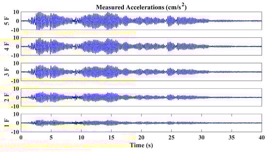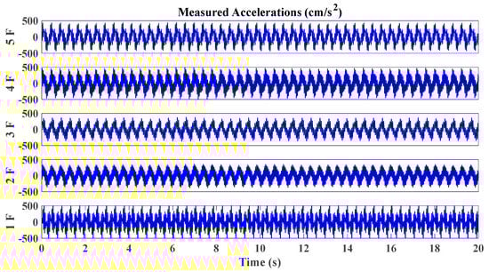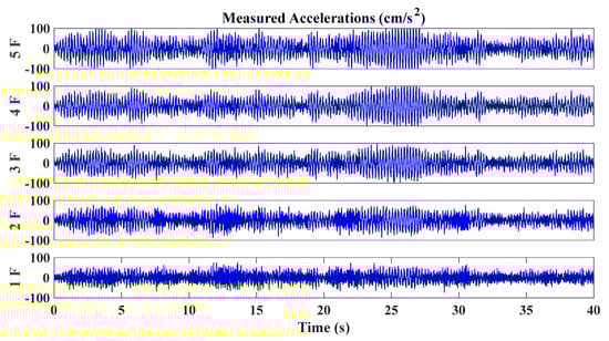 Relevant structural parameters are given as follows: the mass of every story is 1 × 104 kg, and the lateral stiffness is 1 × 108 N/m; the damping ratio is assumed to be 1% for all modes; the first five natural frequencies of the simulated shear model are given as 4.53 Hz, 13.22 Hz, 20.84 Hz, 26.78 Hz and 30.54 Hz; the data sampling frequency was 100 Hz, and the time duration of each story response is 40 s. Considering the disturbance of environmental influence, 5% noise level is added into the acceleration data. In this study, we only consider the damage occurring on one single floor, and the structural damage is simulated by the inter-floor stiffness reduction. Each damage case is a single floor damage with one certain damage degree. Totally we design five different damage locations corresponding to five floors respectively, with five degrees of damage (10%, 20%, 30%, 40% and 50% reduction of inter-floor stiffness) occurring on each floor. Thus, there are totally 5 × 5 = 25 damage scenarios. The simulated stiffness degradation is a typical damage mode for buildings, which can represent a general situation in the SHM of civil structures [,,]. Figure 4 and Figure 5 illustrate the typical acceleration time histories of all stories of the simulated shear building model under mutually correlated white noises and El Centro earthquake excitation, respectively.