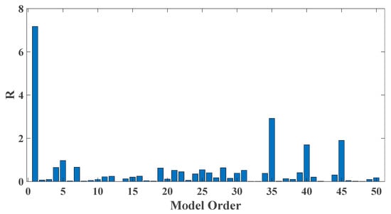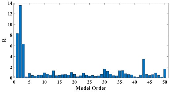 where denotes the OSPA value of the ith floor (). If the result of damage localization is correct, the value of the numerator in Equation (18) would be much larger than the denominator, so the value of R would be rather large meanwhile. Otherwise, if the value of the numerator in Equation (18) is much less than the denominator, then the value of R would be very small, indicating an unsatisfactory identification result. Therefore, the optimal order for ideal damage detection is corresponding to the highest R value. With changing the AR order from 1 to 50, all the corresponding R values are shown in Figure 10 and Figure 11. Normally, the selection of AR order obeys the AIC criterion. Given the time series response of the third floor (the case of 30% damage occurring on the third floor) as an example, as shown in Figure 12 and Figure 13, the AIC criterion indicates that the optimal model order is 13 for both cases of white noises excitation and El Centro earthquake excitation. However, it can be clearly observed that the most considerable R value is obtained by selecting AR order = 1, while choosing 13 as the AR order (according to AIC criterion) cannot give an appropriate identification result. Due to the limitation of AIC criterion in this case, we suggest selecting AR order = 1 instead of 13 as the optimal model order.