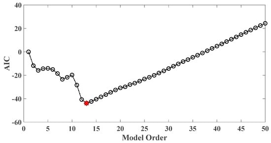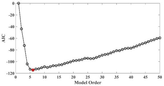 where z denotes the independent variable in the z domain, depicts the system function in the z domain, indicates the denominator polynomial of transfer function. The AR coefficients can be estimated by the well-known Burg’s method [] based on forward and backward prediction errors; complex poles, which are denoted as , satisfy the condition for which and are determined by the AR coefficients , i.e., the roots of the polynomial ; model order can be given by the extensively Akaike Information Criterion (AIC) [], which is defined by:
