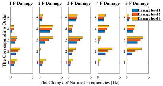 where indicates the ith natural frequency of the undamaged structure, depicts the ith natural frequency of the damaged structure, represents the change of the ith natural frequency of the structure.