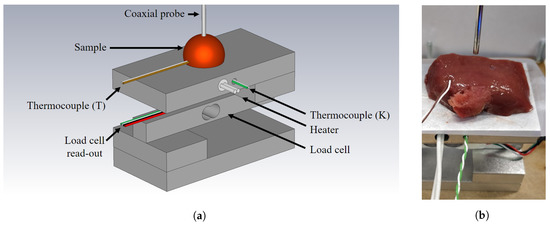 Dielectric properties of tissues can be extracted with several techniques, e.g., the reconversion of measured scattering parameters of transmission lines [20] or a cavity perturbation [21]. During recent years, the slim form, open-ended coaxial probe has become the most applicable technique for dielectric measurements [22,23]. The probe’s position is fixed throughout the experiment to eliminate the introduction of inaccuracies. The tissue sample is placed on a movable platform. Next, an operator gently raises the sample until it contacts the probe. Unfortunately, there is no guideline on when the operator should stop, i.e., which probe-to-tissue contact pressure is desired and how it varies over time. The literature reveals that the probe-to-tissue contact pressure in other biology-related disciplines has a significant impact on the measurements of, for instance, pressure waves in acoustic radiation force (ARF)-based ultrasound elasticity measurements [24], low-frequency electromagnetic waves for electrical bioimpedance measurements [25,26,27], and electromagnetic waves in the visible light and infrared spectrum for measurements of optical properties [28]. These results suggest that the probe-to-tissue contact pressure is significant and cannot be neglected. To the authors’ best knowledge, no reports are currently available on the effect of this contact pressure regarding dielectric measurements of biological tissue and whether or not it is significant as well.