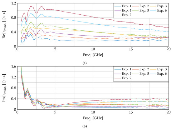 The calculated combined complex uncertainty scomb. for each conducted experiment, the real and imaginary part, in, respectively, (a,b).