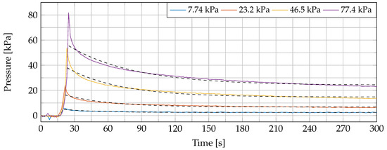 We believe that the tissue conformed its shape to the probe, which resulted in a pressure redistribution over time. Next, the dielectric probe was released and a two-minute rest period was incorporated to let the sample recover to its initial state following the employed procedure in [26]. The measurement was repeated nine times at the same sample location at linearly, gradually increasing pressures from 15.5 kPa (6 g) to 77.4 kPa (30 g) while incorporating the same recovery interval between measurements. An exponential decay of applied probe-to-tissue contact pressure over time was monitored in each measurement. This effect is displayed in Figure 3 for four different pressure levels with a fitted exponential curve through these values (dashed black lines in the same figure). The values of the exponential fitting procedure are shown in Table 1 for the 10 different pressure levels. A similar exponential decay was reported in [33].