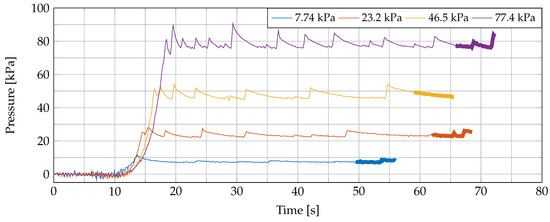 The measured pressure during four measurements of Experiment 5 with our PI-controlled pressure loop. The dielectric measurement is performed during the time span indicated as a thicker line.