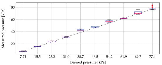 The actual measured pressure during the dielectric measurements of Experiment 5, graphically presented in a box plot, with respect to the desired pressure (dashed black line). (The horizontal red line indicates the median value and the blue box ranges from the 25th to the 75th percentile, respectively called Q and Q. The minimum and maximum values are indicated with the horizontal black lines except if they are smaller than Q (Q – Q) or larger than Q (Q – Q). In that case, they are represented with a red +.).