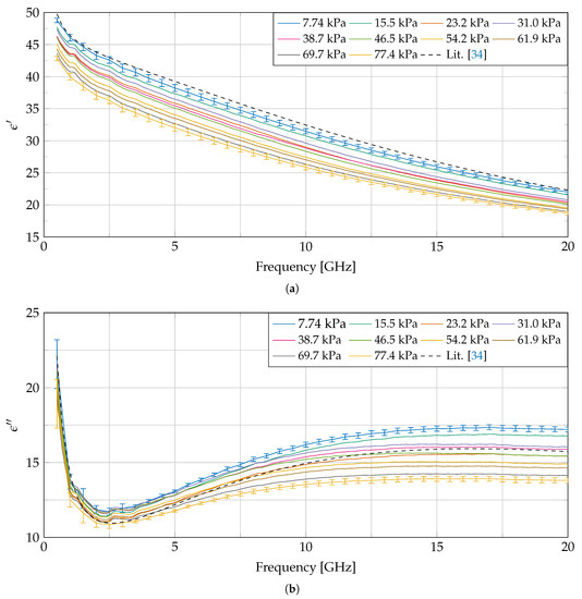 The measurements are conducted in the frequency range from 500 MHz to 20 GHz. This means that we are above the - and -dispersion and that the measurements should not dependent on the shape of the cell nor on the dipolar moments related to the cell membrane [36]. Therefore, we can roughly approximate the tissue as a two-phase composite with two separate volume fractions. The first phase represents several fluids, e.g., cytoplasm and interstitial fluids, which can be approximated as a saline solution. The second phase contains all other inclusions, e.g., bipolar lipid membranes, cell organelles, and proteins. If we would continue the same line of reasoning as in the aforementioned literature, i.e., pushing away interstitial and intracellular fluid, then the sensed volume would contain a higher concentration of proteins and membranes when applying pressure. Both of them typically have a lower complex permittivity value than a saline solution, as shown in [37,38], respectively. Given the composition of the liver [39], the cytoplasmic matrix and the intercellular spaces (host medium) are responsible for of the liver volume. When we assume that this host volume is filled with a 0.1 M saline solution with permittivity , we can calculate the complex permittivity of the inclusions from the effective permittivity obtained during the lowest pressure measurement, using the Landau–Lifshitz–Looyenga mixing formula [40]: