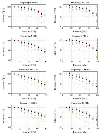 Linear slopes of relative changes in complex permittivity per kPa at the frequencies from Figure 7.