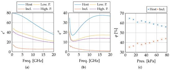 The dielectric properties of the host medium, the inclusions, and the compared to the measurements at 7.74 kPa (Low. P.) and 77.4 kPa (High. P.) with the real and imaginary part in, respectively, (a,b). The calculated volume fractions j are displayed in (c).