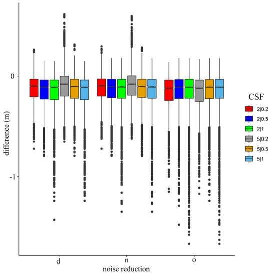 Difference between ground reference and the modeled values by noise filtering methods (d: surface distance-based, n: neighborhood distance-based filtering, o: original point cloud) and cloth simulation filter (CSF) settings (cloth size | threshold).