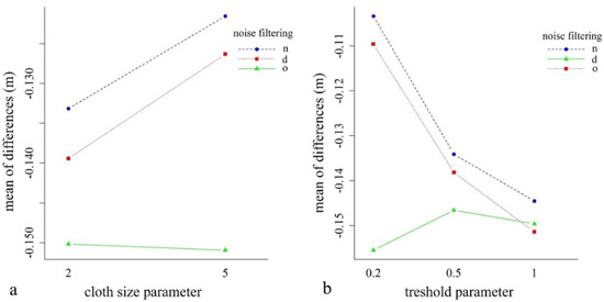 Mean differences (m) between the cloth size (a) and the threshold (b) parameters according to the noise filtering (d: surface distance-based, n: neighborhood distance-based filtering, o: original point cloud).