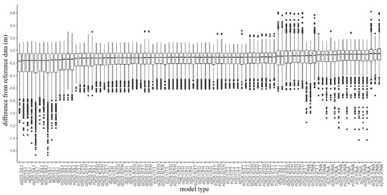 Considering the noise reduction itself, according to the Welch test, all models had significant differences (F = 194.1; df = 7.18 × 10−4; p < 0.001). In the following step, we analyzed the effects of CSF parameters, the cloth sizes, and thresholds (Figure 4). The smallest differences were obtained using the point clouds with noise reduction and the cloth size of 5, and a threshold of 0.2 occurred in the models (the difference was −0.08 m in relation to the reference). In the case of the original point cloud, these parameters provided the worst model, having the poorest accuracy (−0.12 m).