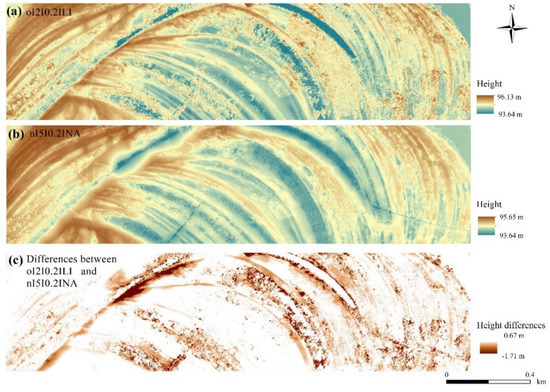 The best and the worst models according to the range of medians and the differences between them: (a) o|2|0.2|LI: o: original database; first number: cloth size parameter (2); second number: threshold parameter (0.2); LI: linear interpolation; (b) n|5|0.2|NA: n: neighborhood-based noise filter; first number: cloth size parameter (5); second number: threshold parameter (0.2); NA: natural neighbor interpolation. (c) The difference between o|2|0.2|LI and n|5|0.2|NA terrain models.