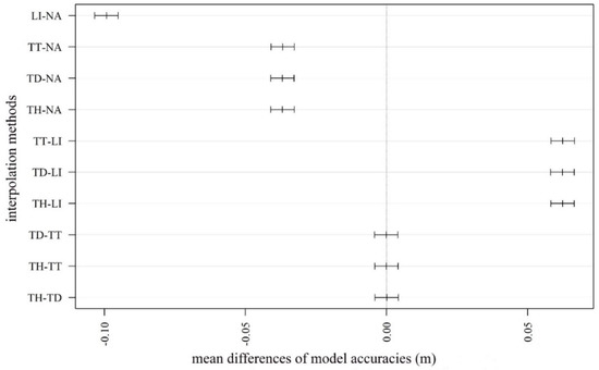 Mean differences by interpolation types (LI: linear interpolation; NA: natural neighbor interpolation; TD: terrain dataset with natural neighbor interpolation; TH: terrain dataset with thinning and natural neighbor interpolation; TT: topo to raster interpolation; error bars: 95% confidence intervals; insignificant differences: where error bars intersected the 0 value, this is shown by the vertical dashed line).