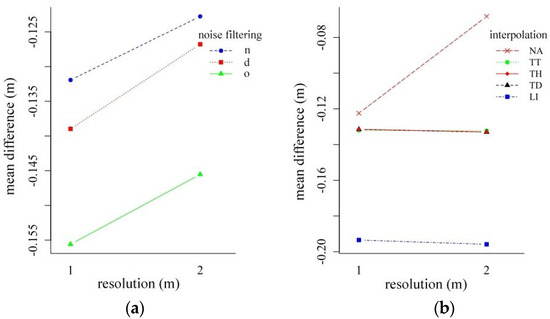Interaction plot of resolution and noise filtering (a) and resolution and interpolation techniques (b) (LI: linear interpolation; NA: natural neighbor interpolation; TD: terrain dataset with natural neighbor interpolation; TH: terrain dataset with thinning and natural neighbor interpolation; TT: topo to raster interpolation; d: surface distance-based; n: neighborhood distance-based filtering; o: original point cloud).